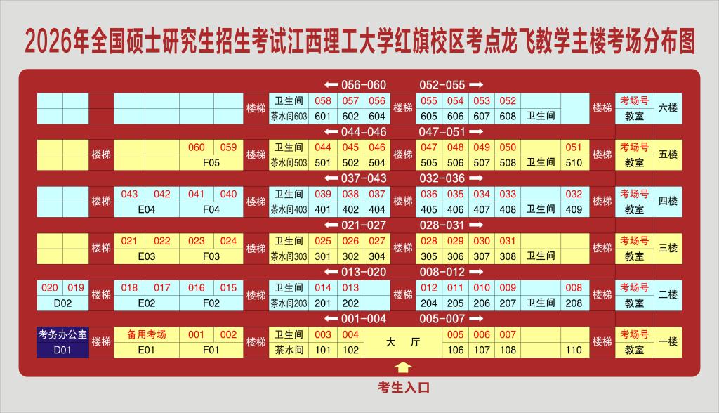 1.江西理工大学红旗校区考点位于赣州市章贡区红旗大道86号,考场分布在龙飞教学主楼。校园示意图如图1所示,考场分布图如图2所示。考生可于12月19日下午到学校南门(红旗大道86号)查看考点考区位置。